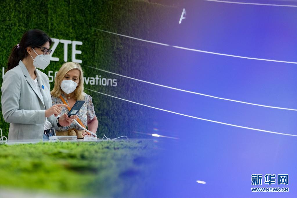 6月29日,在西班牙巴塞罗那,工作人员(左)在世界移动通信大会中兴展厅向观众介绍一款5G手机。