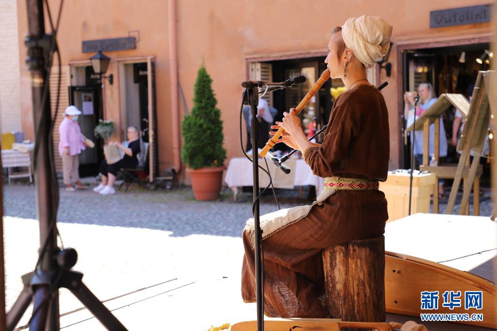 7月1日,一名身着中世纪风格服装的表演者在芬兰图尔库举行的“中世纪市集”上演奏。