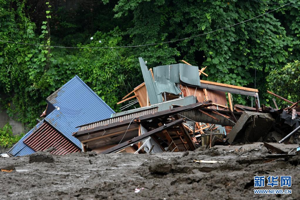 这是7月4日在日本静冈县热海市拍摄的在泥石流灾害中受损的建筑残骸。