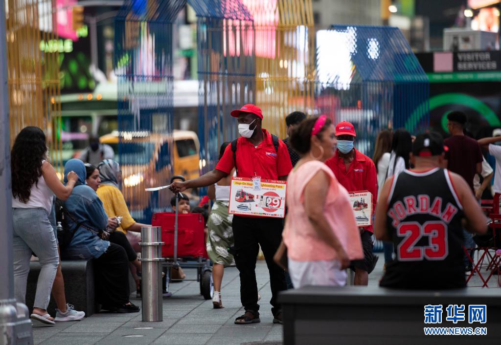 7月2日,观光大巴推销员在美国纽约时报广场上向游客推荐线路。