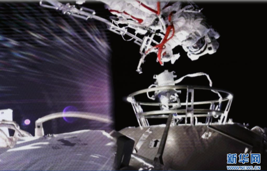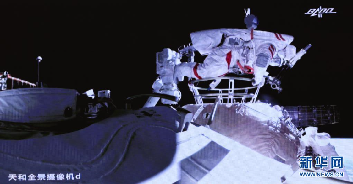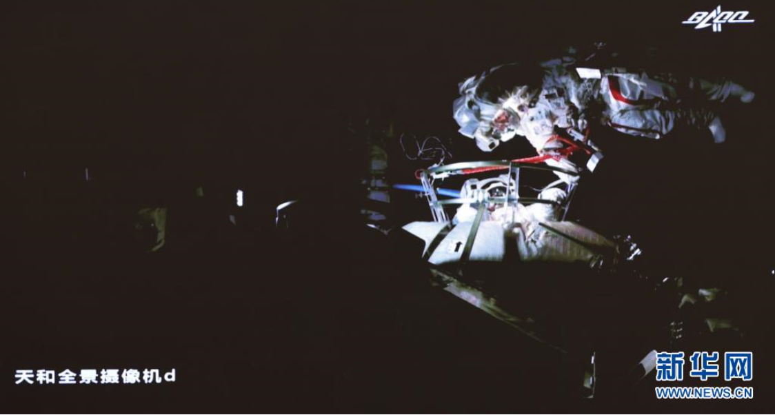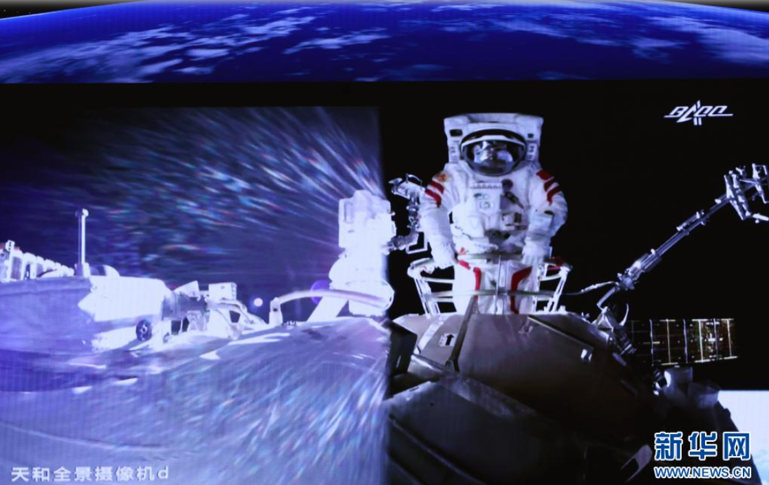 7月4日,在北京航天飞行控制中心大屏拍摄的航天员刘伯明在舱外工作场面。 据中国载人航天工程办公室消息,北京时间2021年7月4日8时11分,神舟十二号乘组航天员刘伯明成功开启天和核心舱节点舱出舱舱门,截至11时02分,航天员刘伯明、汤洪波身着中国自主研制的新一代“飞天”舱外航天服,已先后从天和核心舱节点舱成功出舱,并已完成在机械臂上安装脚限位器和舱外工作台等工作,后续将在机械臂支持下,相互配合开展空间站舱外有关设备组装等作业。期间,在舱内的航天员聂海胜配合支持两名出舱航天员开展舱外操作。 新华社记者 金立旺 摄