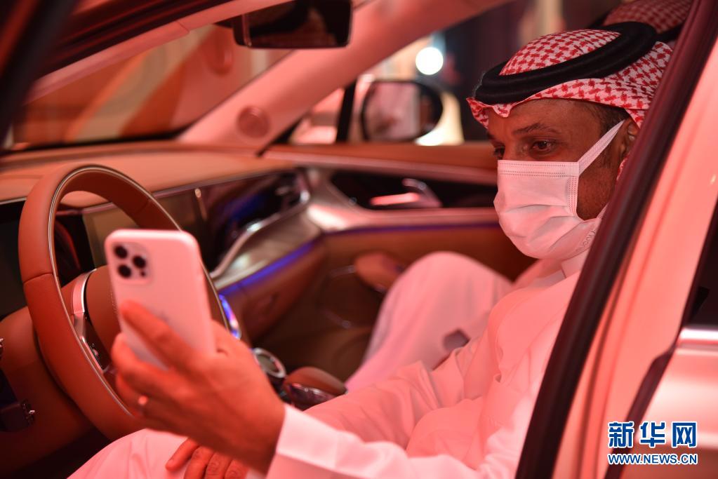 6月30日,在沙特利雅得的中国一汽红旗旗舰店内,一名男子在车内自拍。新华社记者 王海洲 摄