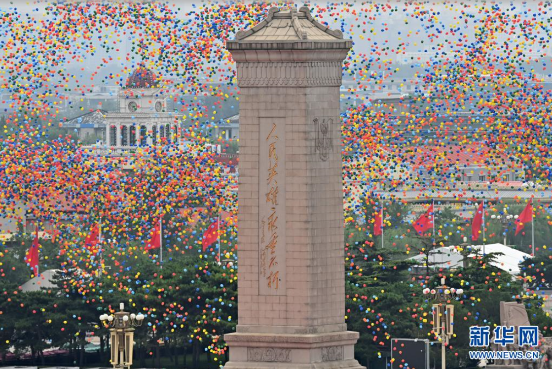 7月1日上午,庆祝中国共产党成立100周年大会在北京天安门广场隆重举行。这是庆祝大会现场放飞气球。