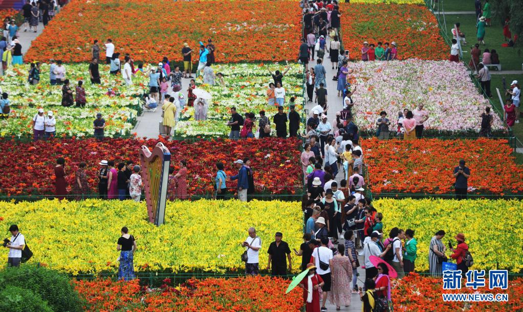 7月6日,市民在沈水湾公园赏花。 近日,在辽宁省沈阳市和平区沈水湾公园,十万株百合花竞相绽放,吸引市民游玩拍照留念。 新华社记者 杨青 摄