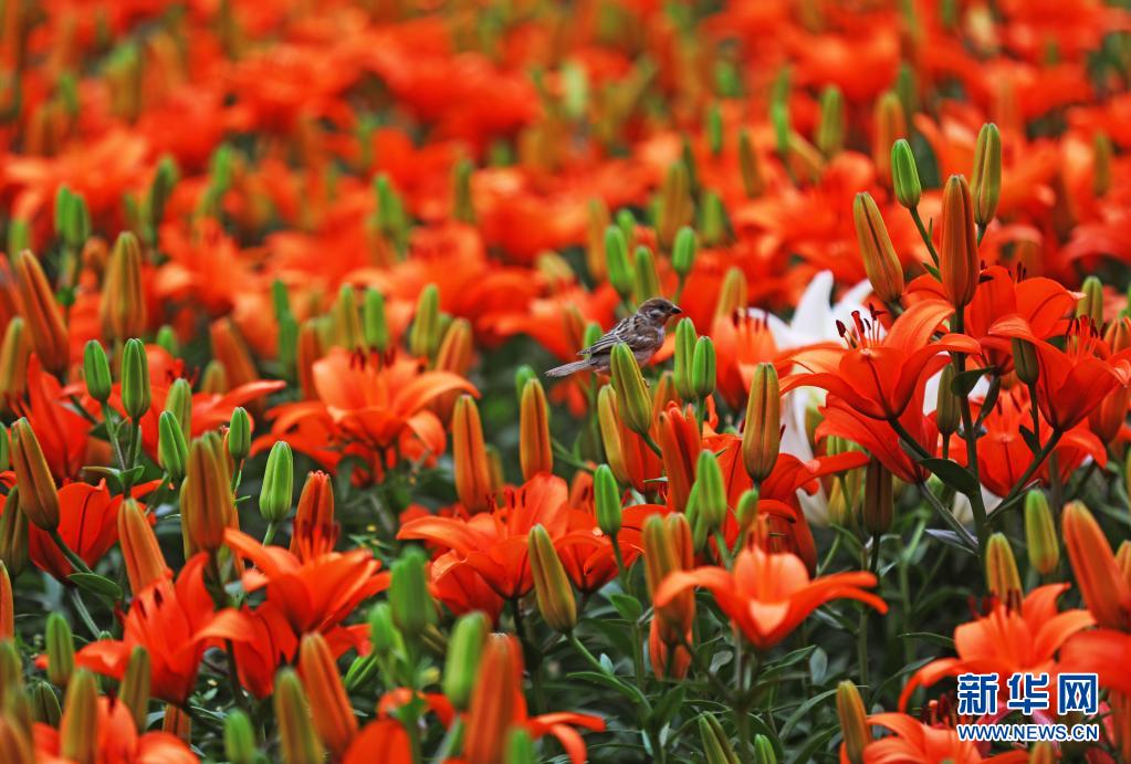 一只小鸟落在百合花上(7月6日摄)。 近日,在辽宁省沈阳市和平区沈水湾公园,十万株百合花竞相绽放,吸引市民游玩拍照留念。 新华社记者 杨青 摄 |