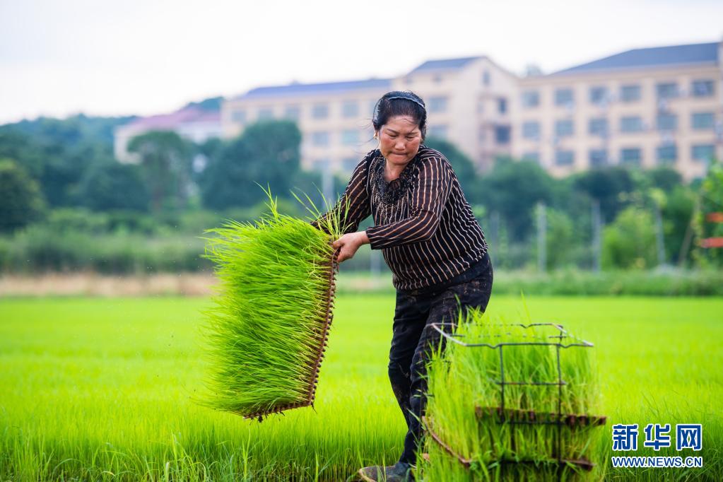 7月7日,在湖南省长沙市浏阳市龙伏镇,村民在秧田起秧苗。 小暑时节,湖南省长沙市浏阳市龙伏镇的早稻成熟,当地农民抢抓农时,在田间抢收早稻、抢插晚稻,田间地头一派繁忙景象。 新华社记者 陈思汗 摄
