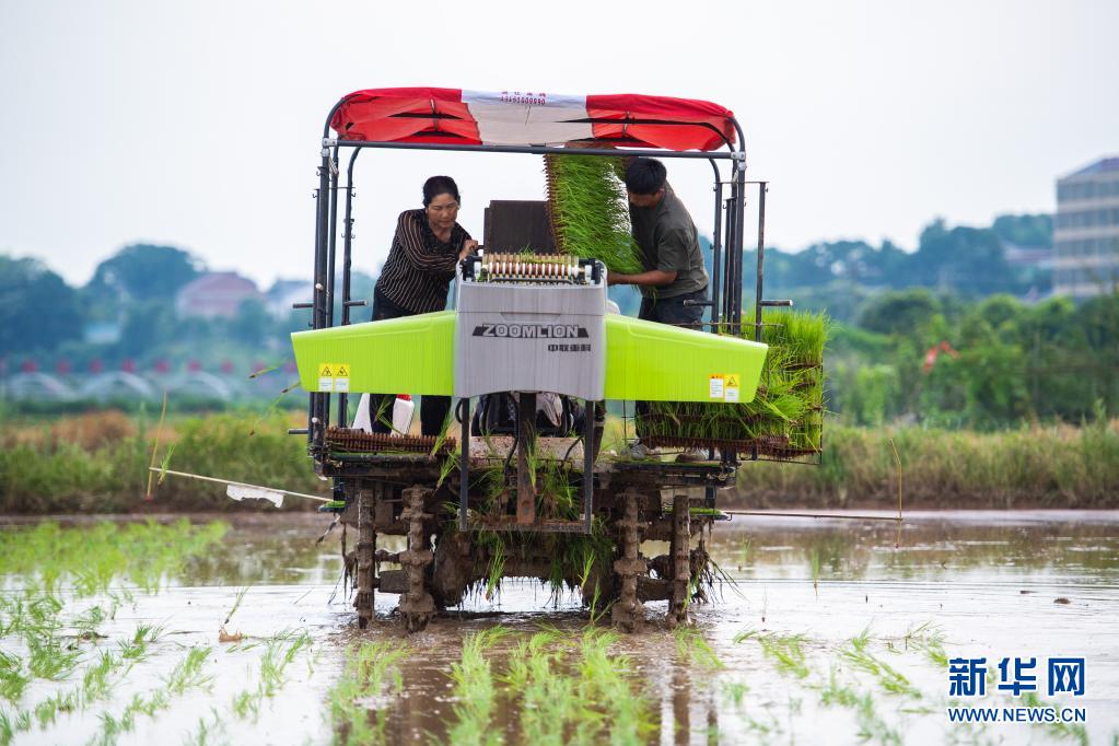 7月7日,在湖南省长沙市浏阳市龙伏镇,村民驾驶抛秧机抛秧。 小暑时节,湖南省长沙市浏阳市龙伏镇的早稻成熟,当地农民抢抓农时,在田间抢收早稻、抢插晚稻,田间地头一派繁忙景象。 新华社记者 陈思汗 摄