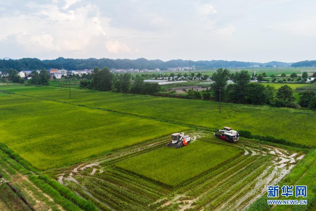 7月7日,在湖南省长沙市浏阳市龙伏镇,村民驾驶收割机收割早稻(无人机照片)。 小暑时节,湖南省长沙市浏阳市龙伏镇的早稻成熟,当地农民抢抓农时,在田间抢收早稻、抢插晚稻,田间地头一派繁忙景象。 新华社记者 陈思汗 摄