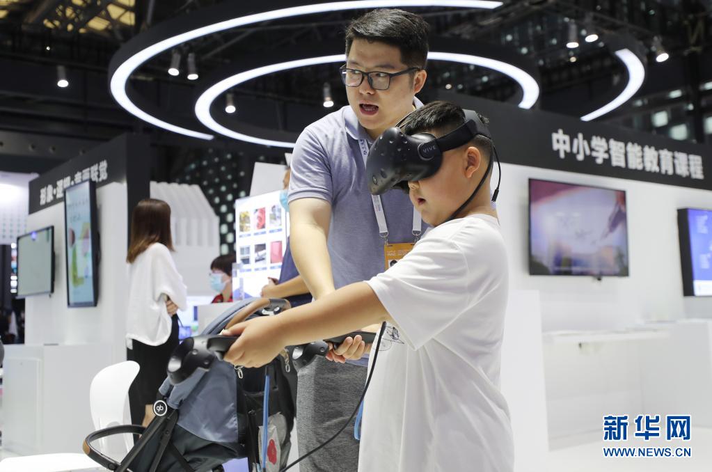 7月8日,小朋友在工作人员指导下体验一款VR眼镜展品。 当日,2021世界人工智能大会在上海开幕。本届大会的主题是“智联世界 众智成城”,设会议论坛、展览展示、竞赛评奖、应用体验等活动,超过300家企业的众多前沿人工智能技术与产品集中亮相。本次大会将持续至7月10日。 新华社记者 方喆 摄