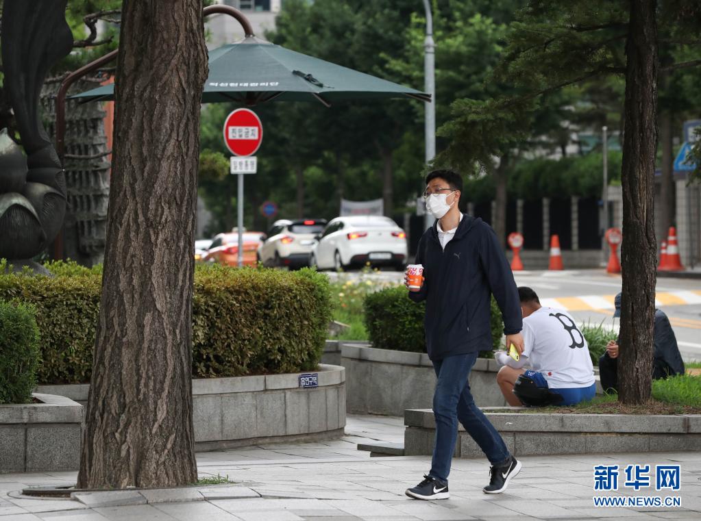 7月9日,行人戴口罩走在韩国首尔光化门附近。