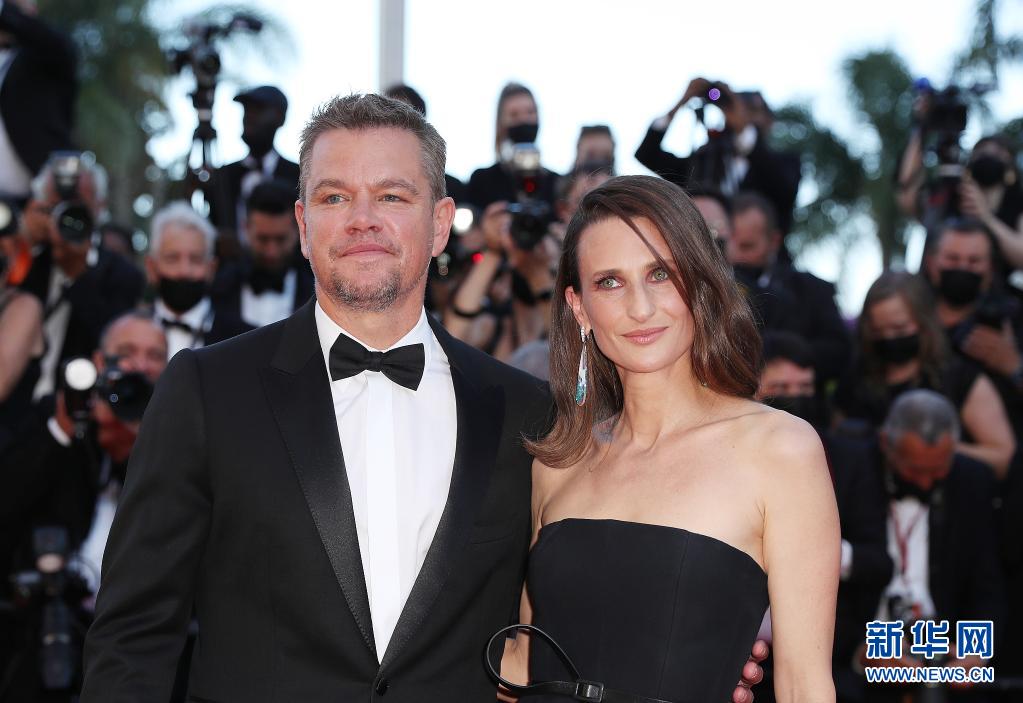 7月8日,在法国戛纳,演员马特·达蒙(左)、卡米耶·科坦亮相非竞赛单元影片《止水》的首映式红毯。