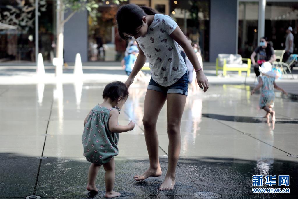7月10日,儿童在美国旧金山湾区城市圣拉蒙一个购物中心前的广场上玩水。