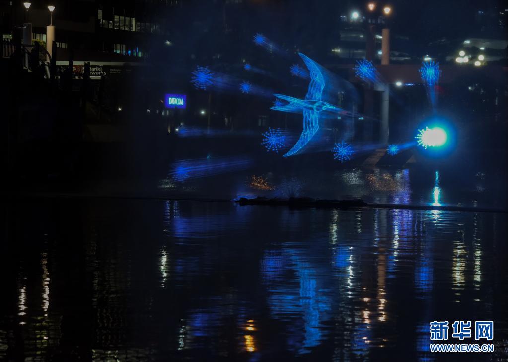 这是7月8日在新西兰惠灵顿海滨拍摄的毛利新年主题水幕秀。8日晚,新西兰惠灵顿上演水幕秀庆祝毛利新年。新华社记者 郭磊 摄