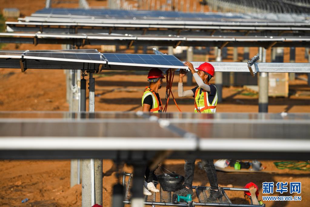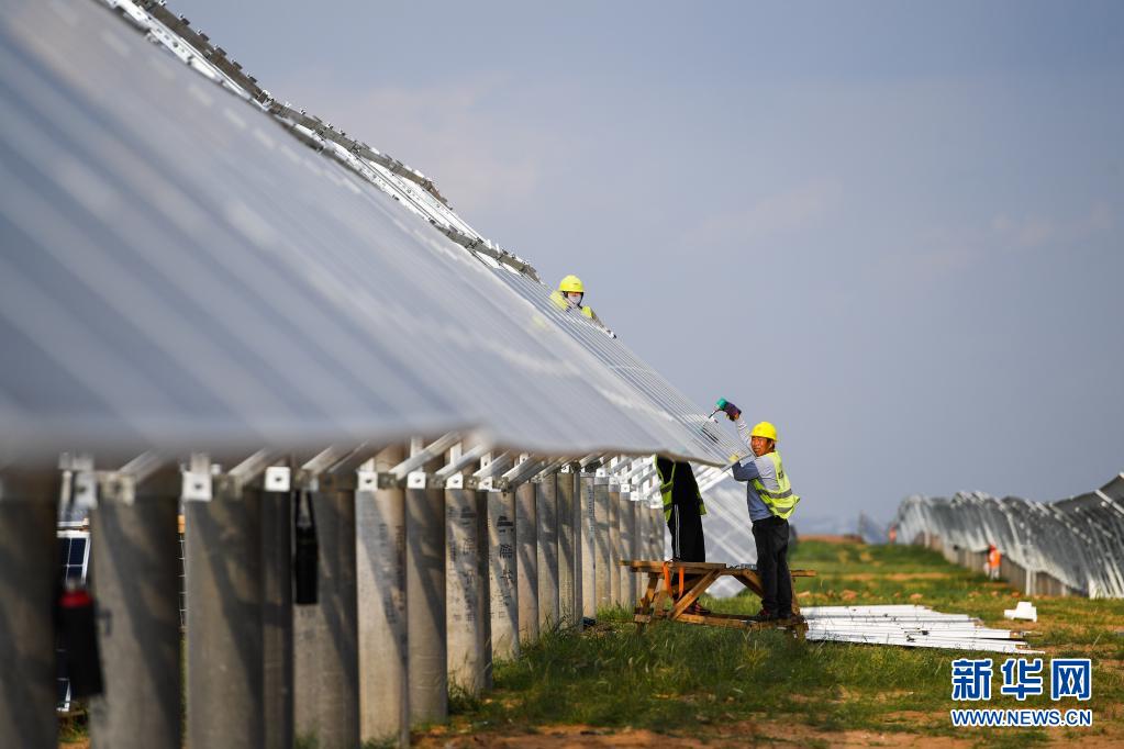 7月13日,工人为天骄绿能50万千瓦光伏发电项目安装光伏板。 位于内蒙古伊金霍洛旗乌兰木伦镇的天骄绿能50万千瓦光伏发电项目是采煤沉陷区生态治理光伏发电的示范项目,项目占地面积约4.2万亩。目前,项目建设进入收尾阶段,预计年内并网发电。 新华社记者 刘磊 摄