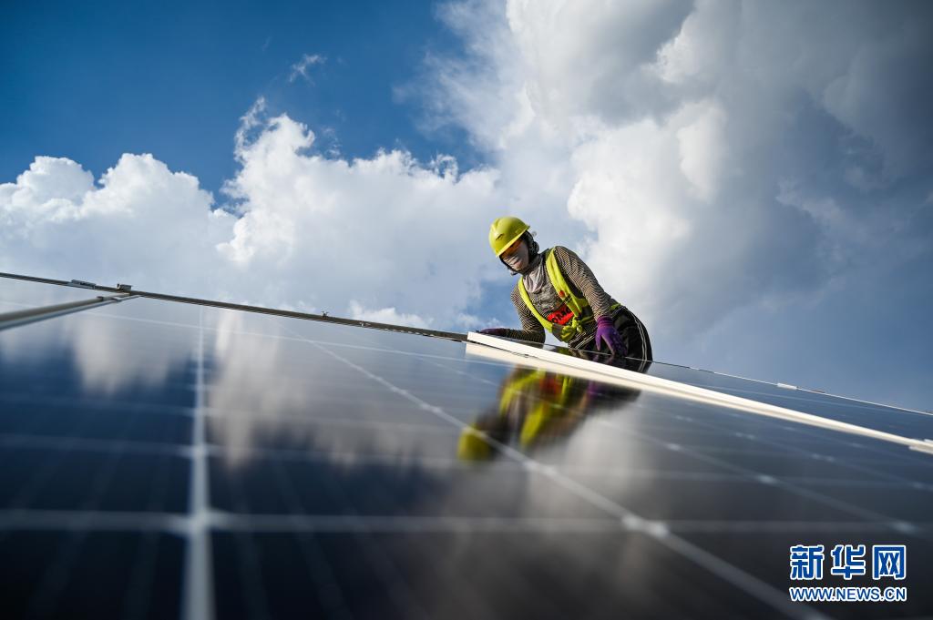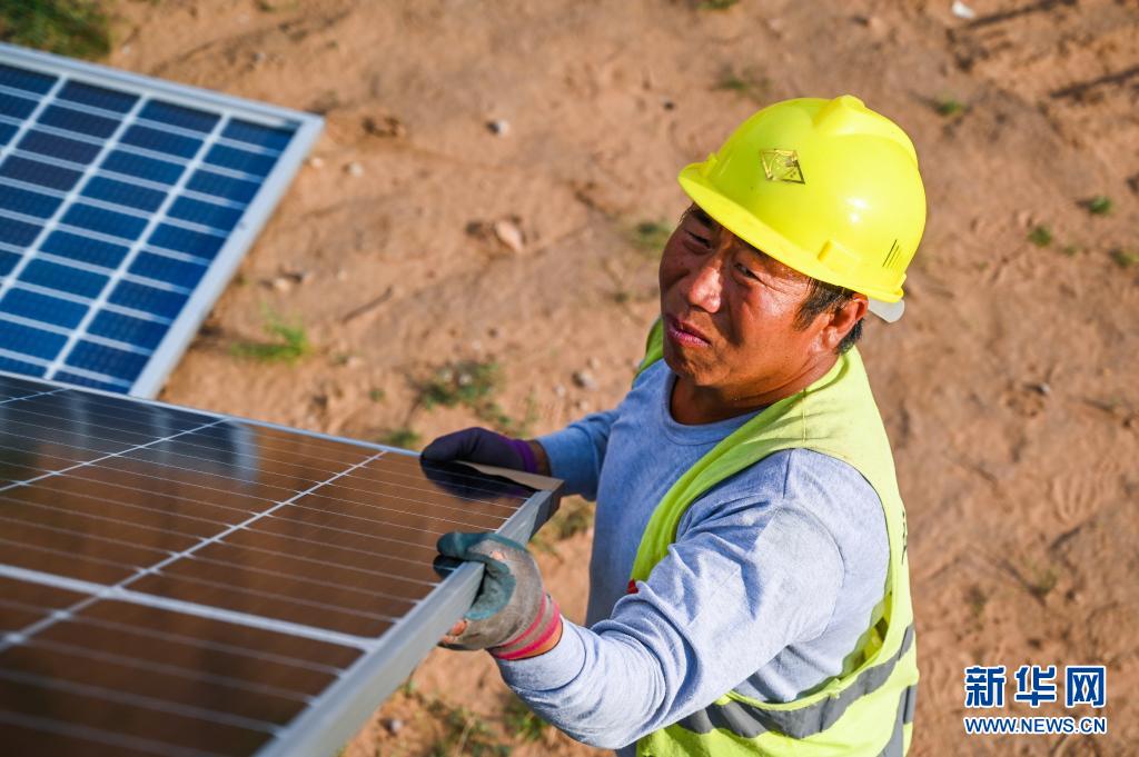 7月13日,一名工人为天骄绿能50万千瓦光伏发电项目安装光伏板。 位于内蒙古伊金霍洛旗乌兰木伦镇的天骄绿能50万千瓦光伏发电项目是采煤沉陷区生态治理光伏发电的示范项目,项目占地面积约4.2万亩。目前,项目建设进入收尾阶段,预计年内并网发电。 新华社记者 刘磊 摄