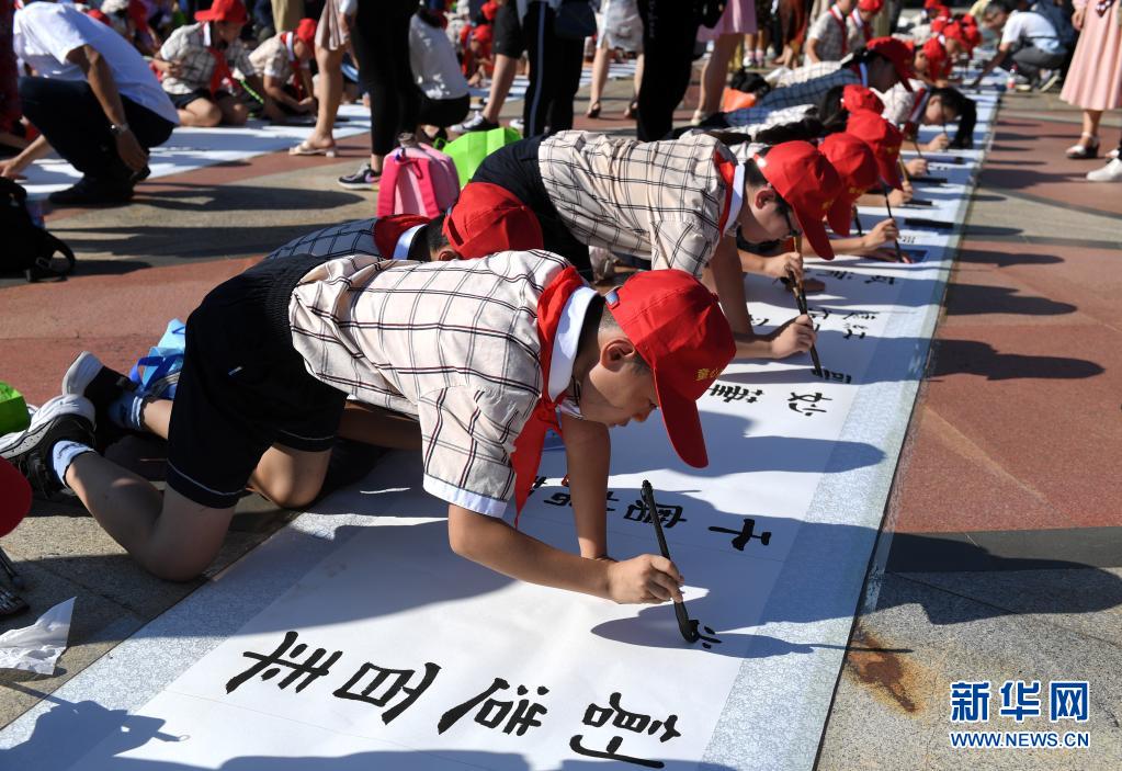 当日,“八桂书风 童心向党”——南宁市百名儿童百米书法长卷现场书写活动在广西南宁市举行,240余名学生现场共同书写百米书法长卷。