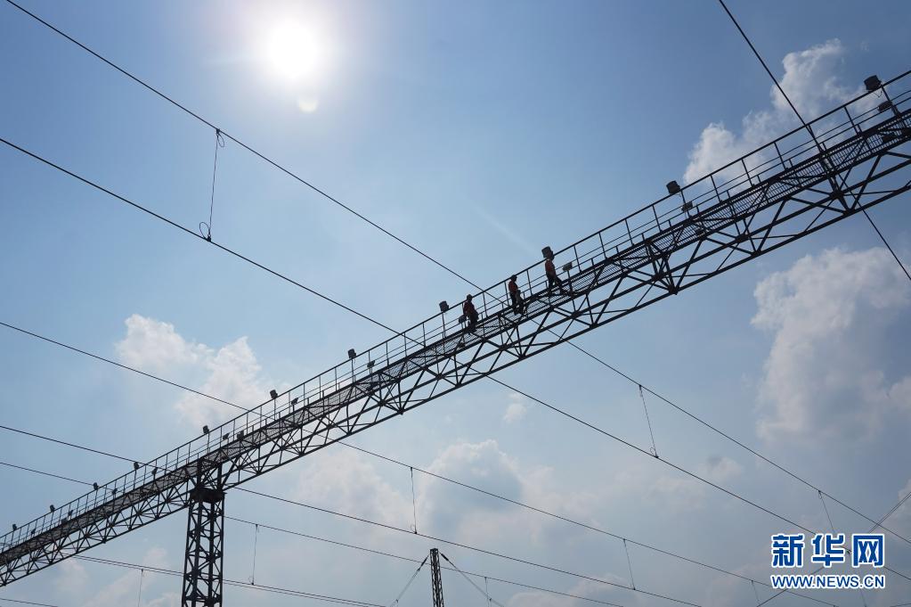 7月14日,电力工人们在南昌西动车所的灯桥上作业。