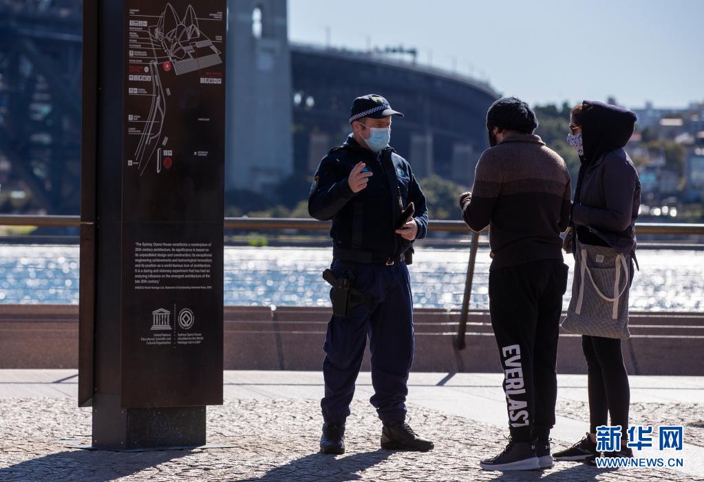 7月18日,在澳大利亚悉尼,行人和执勤警察交谈。 澳大利亚第一大城市悉尼开始实施更严格的封城措施,只有药店、银行等关键商业设施可以营业,强制佩戴口罩的范围也进一步扩大。 新华社记者 白雪飞 摄
