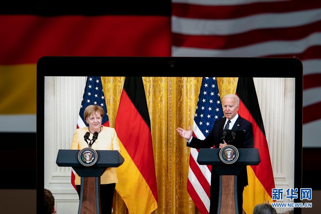 7月15日拍摄的直播画面显示,美国总统拜登(右)与到访的德国总理默克尔在美国华盛顿白宫举行联合记者会。 美国总统拜登15日与到访的德国总理默克尔举行会晤,双方就两国关系以及地区和全球性问题展开讨论。新华社记者 刘杰 摄