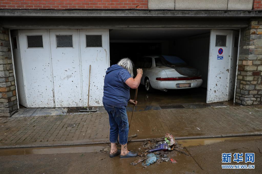 7月16日,居民在比利时韦尔维耶打扫被洪水浸泡过的车库。