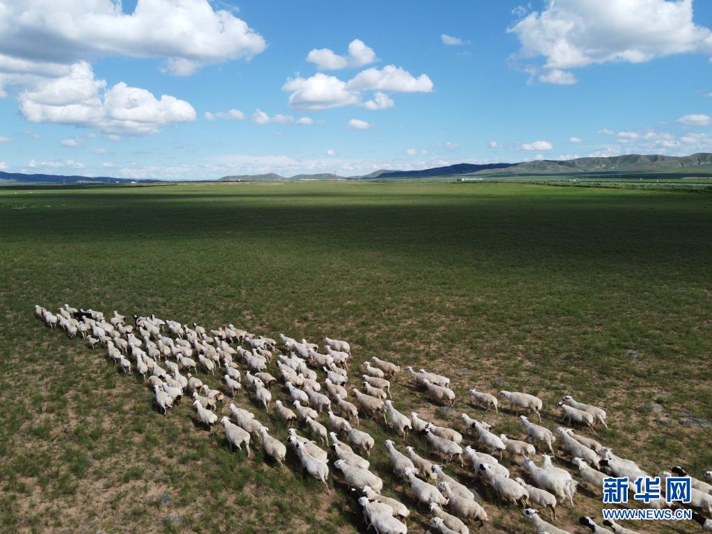 7月19日,羊群在锡林郭勒草原上觅食(无人机照片)。
