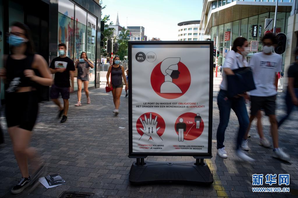 7月19日,人们在比利时布鲁塞尔的一条商业街上经过一处防疫提醒标识。 比利时国家公共卫生研究所最新公布的新冠疫情数据显示,该国疫情近期有反弹趋势,过去14天日均新增确诊病例1134例,累计确诊已超过110万例。 新华社记者 张铖 摄 |