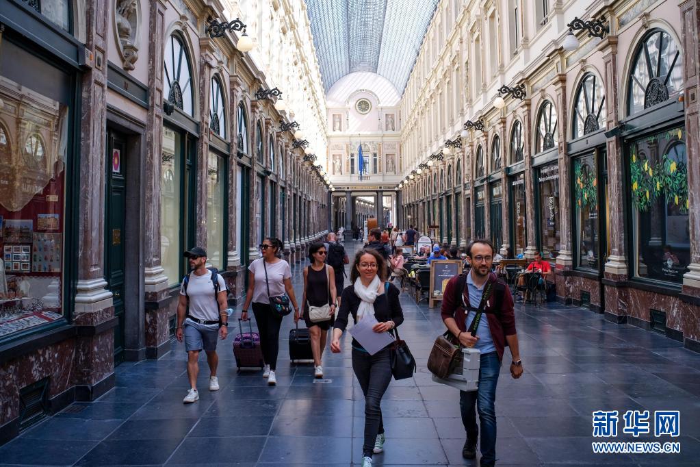 7月19日,游客在比利时布鲁塞尔圣于贝尔购物长廊游览。 比利时国家公共卫生研究所最新公布的新冠疫情数据显示,该国疫情近期有反弹趋势,过去14天日均新增确诊病例1134例,累计确诊已超过110万例。 新华社记者 张铖 摄