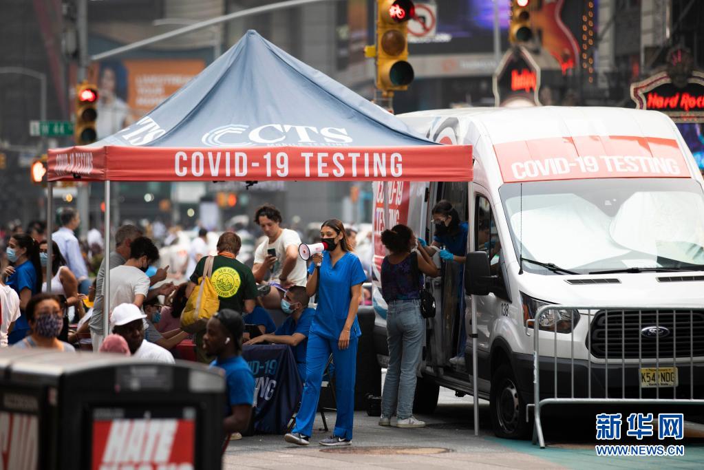 7月20日,人们在美国纽约时报广场的一个移动新冠检测点接受检测。