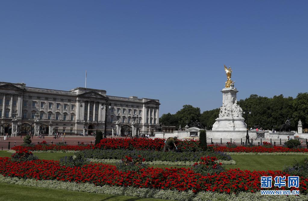 7月20日,一名园丁在英国伦敦白金汉宫门前修剪花草。