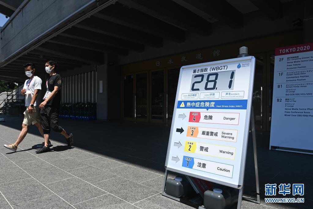 这是7月21日拍摄的日本武道馆门前的气温指示牌。