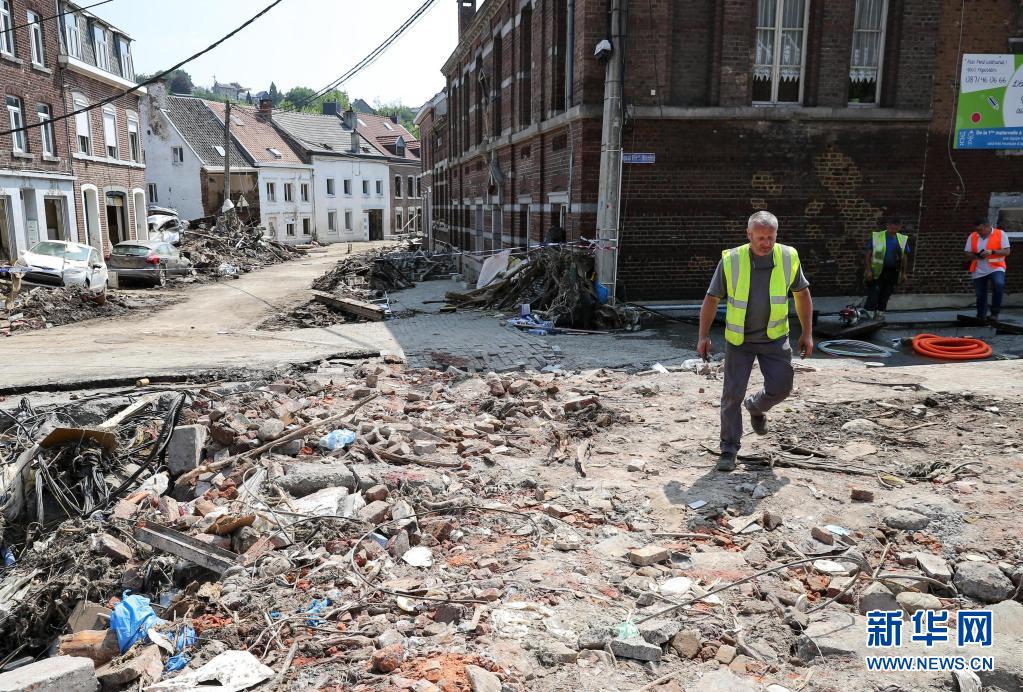 7月20日,一名工作人员在比利时受灾严重的佩平斯特走过受损的街道。