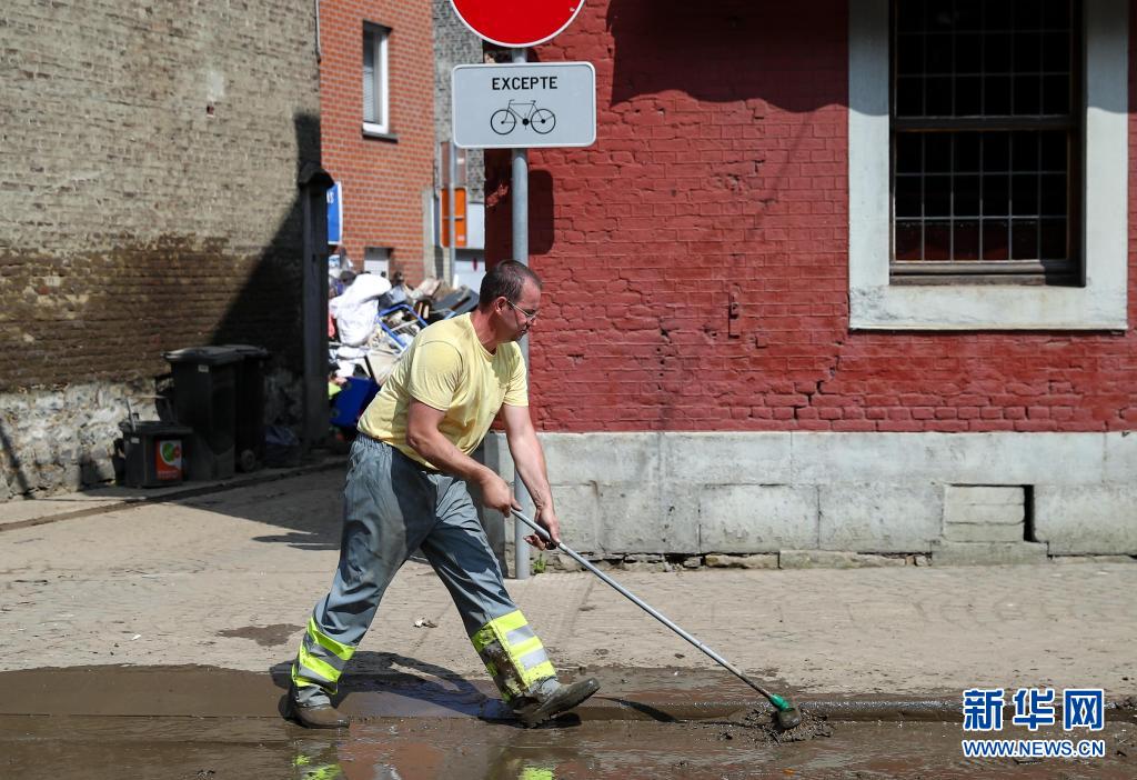 7月20日,一名工作人员在比利时受灾严重的佩平斯特清扫街道。