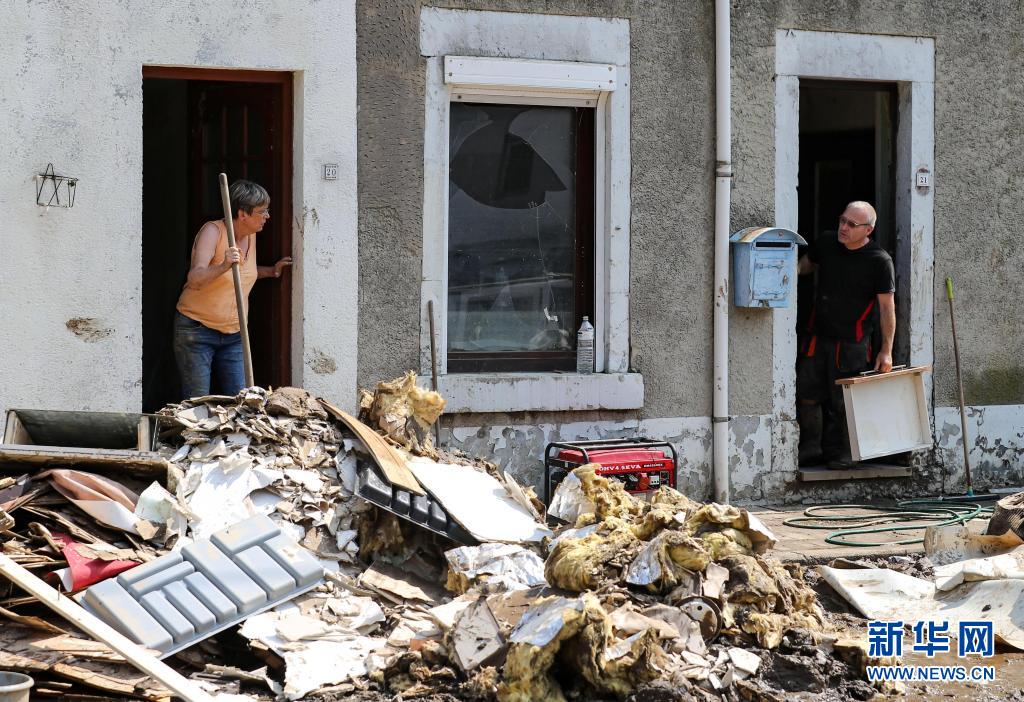 7月20日,人们在比利时受灾严重的佩平斯特清理垃圾。