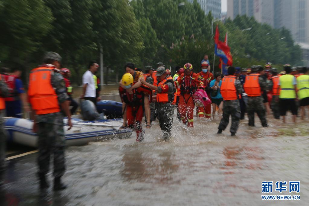7月22日,在阜外华中心血管病医院附近,救援人员转移人员。