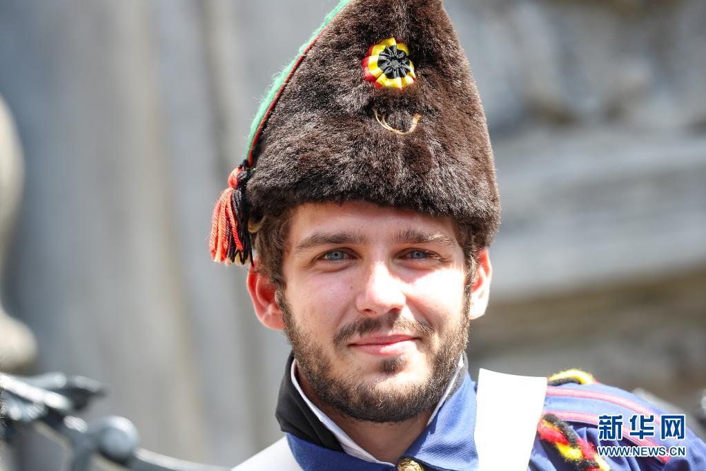 7月21日,一名男子身着比利时独立战争志愿军服装在比利时布鲁塞尔庆祝国庆日。