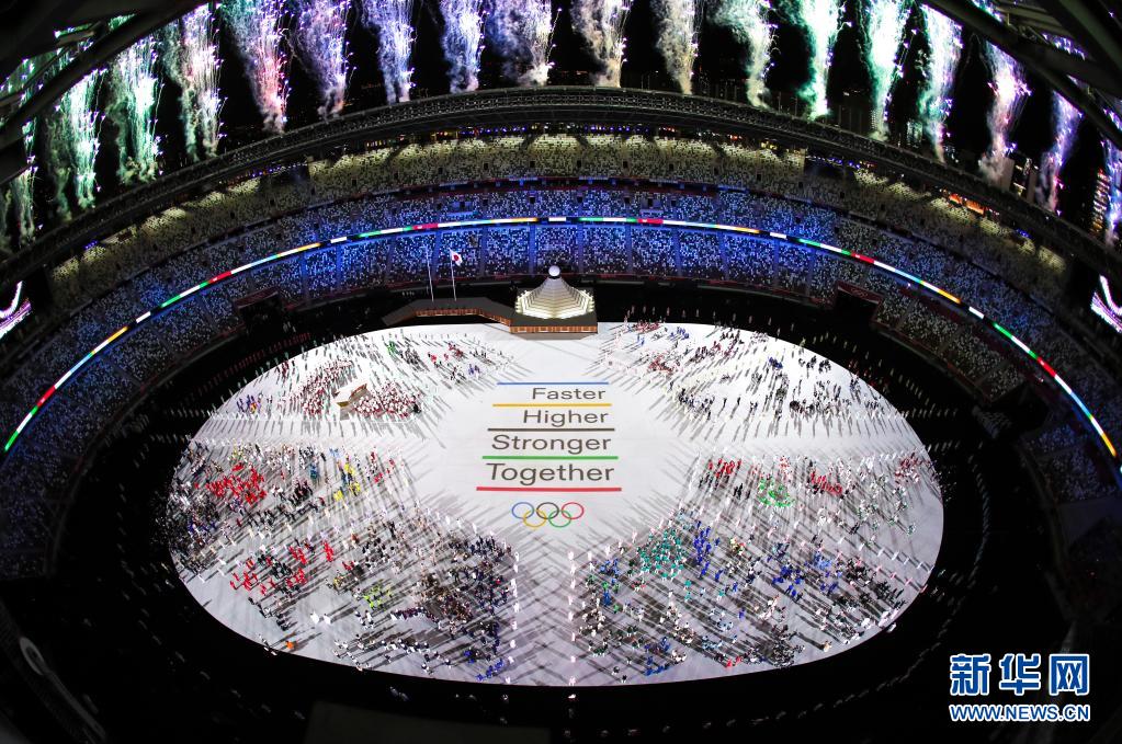 这是东京奥运会开幕式场地中央显示的奥林匹克格言“更快、更高、更强、更团结”(7月23日摄)。新华社记者 徐子鉴 陈益宸 夏一方 摄