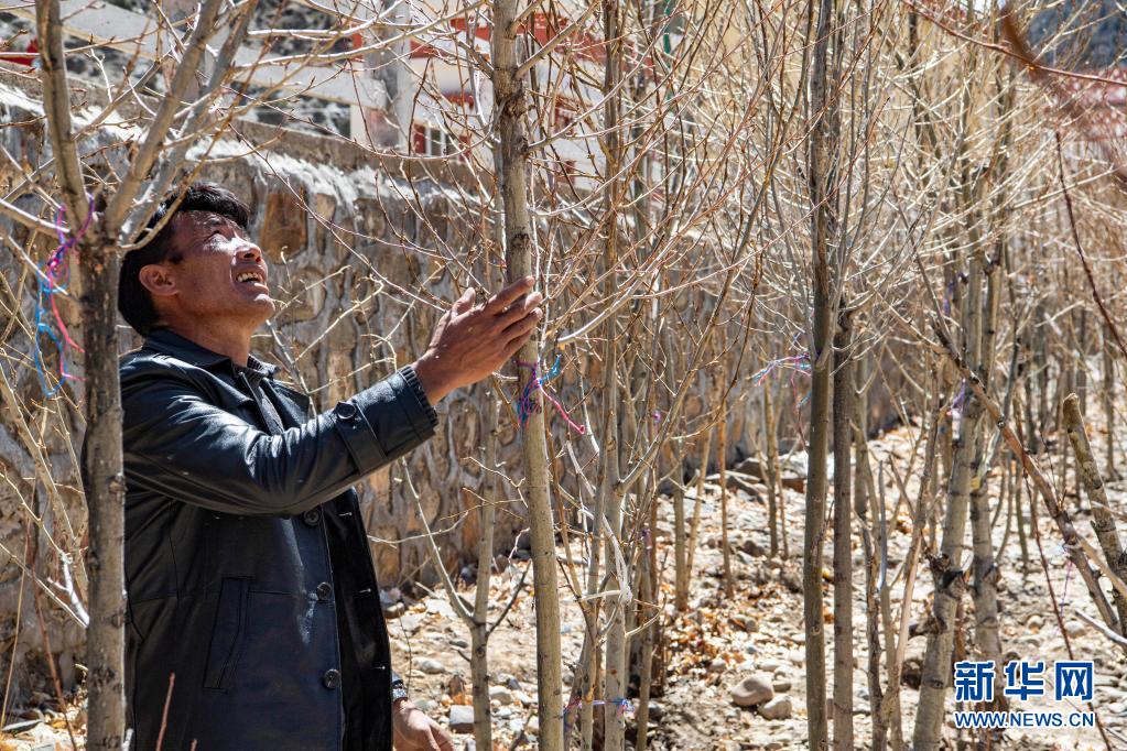在昌都市左贡县列达村,罗松旺堆在查看河堤上树苗的长势(3月28日摄)。