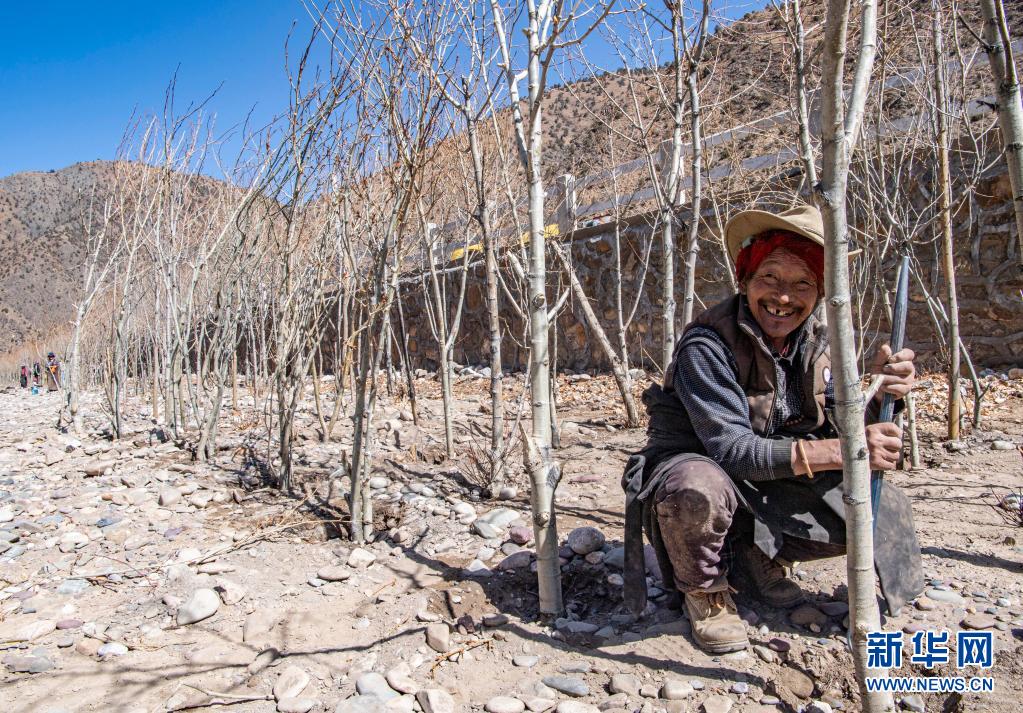 在西藏昌都市左贡县列达村,村民在河堤上植树(3月28日摄)。