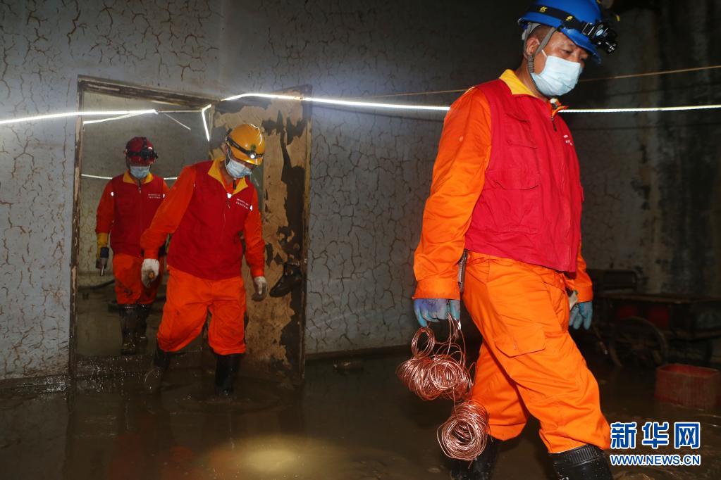 7月28日,在郑州市二七区一社区的楼房地下室,来自浙江金华的援豫电力抢修人员准备前往配电房抢修。