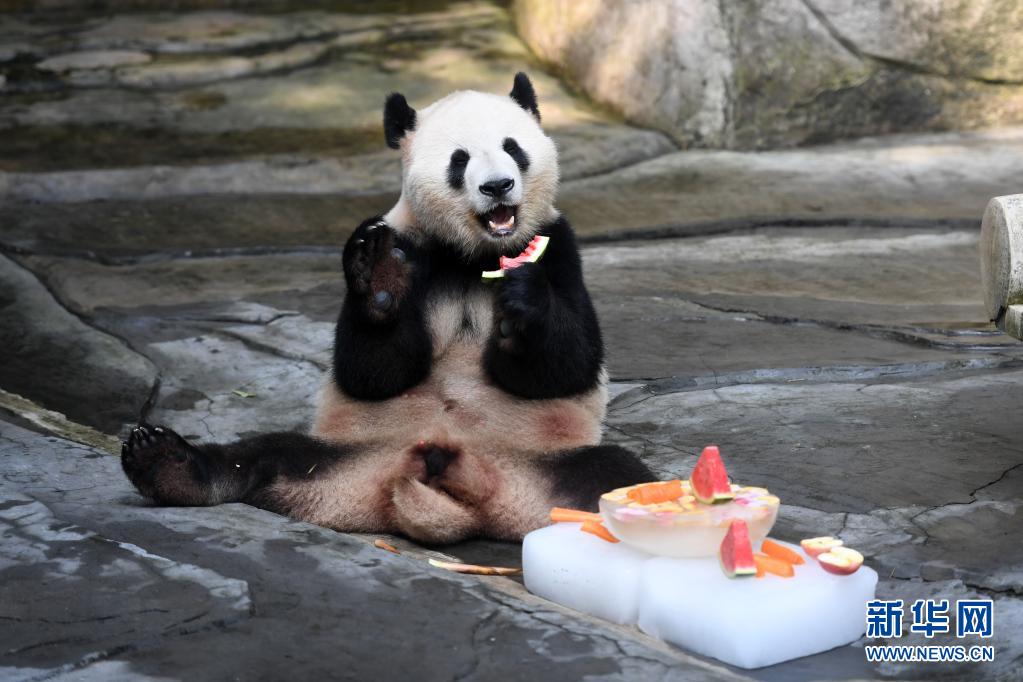 7月29日,在重庆动物园,大熊猫在玩冰“消暑”。近来重庆连日高温,重庆动物园为了让动物们清凉度夏,采用多种“妙招”为动物们防暑降温。新华社记者 唐奕 摄