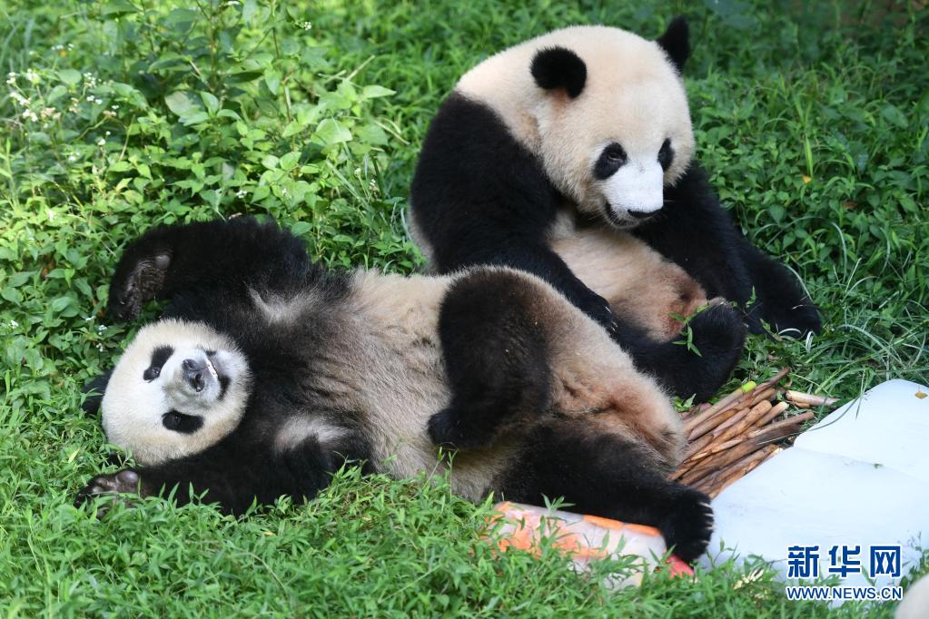 7月29日,在重庆动物园,两只大熊猫玩水“消暑”。近来重庆连日高温,重庆动物园为了让动物们清凉度夏,采用多种“妙招”为动物们防暑降温。新华社记者 唐奕 摄