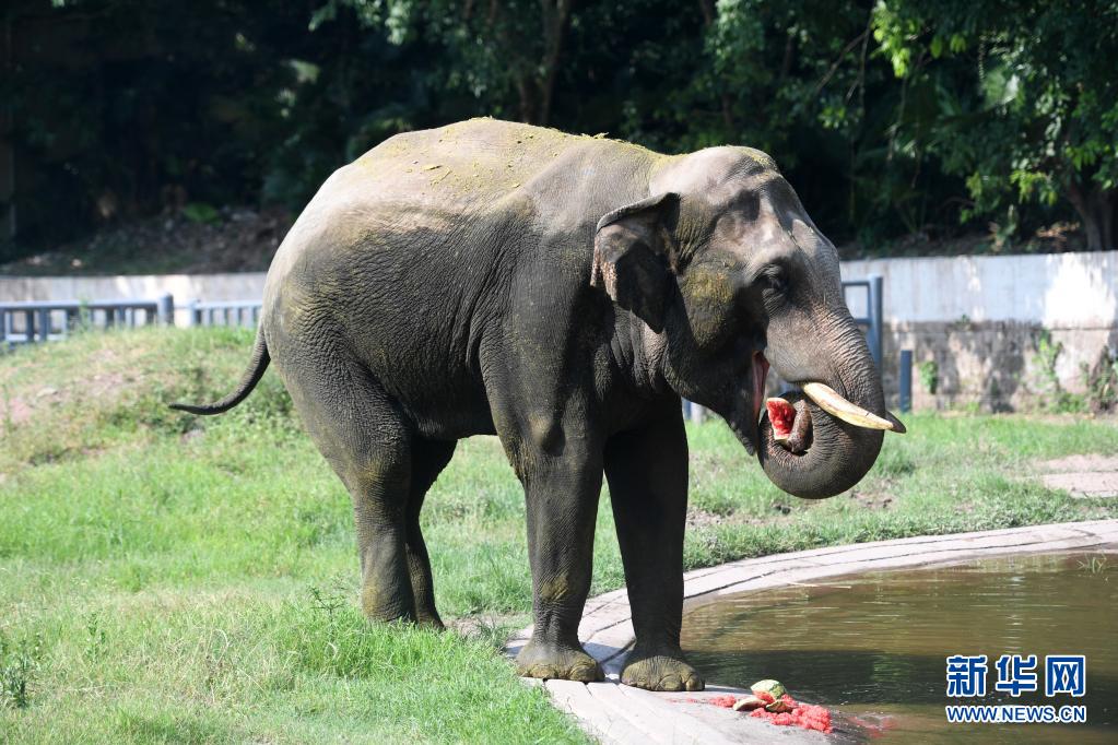 7月29日,在重庆动物园,一只大象在吃西瓜。近来重庆连日高温,重庆动物园为了让动物们清凉度夏,采用多种“妙招”为动物们防暑降温。新华社记者 唐奕 摄