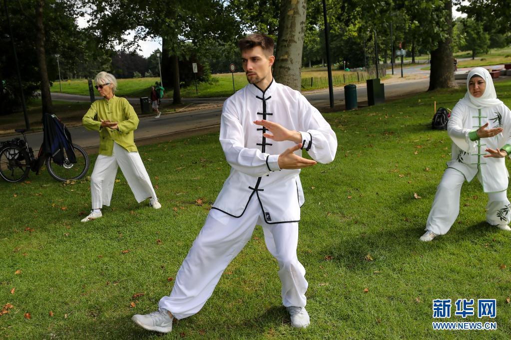 7月28日,人们在比利时布鲁塞尔的拉肯公园练习太极。