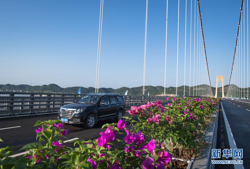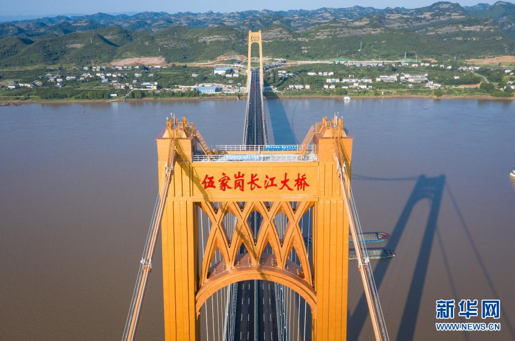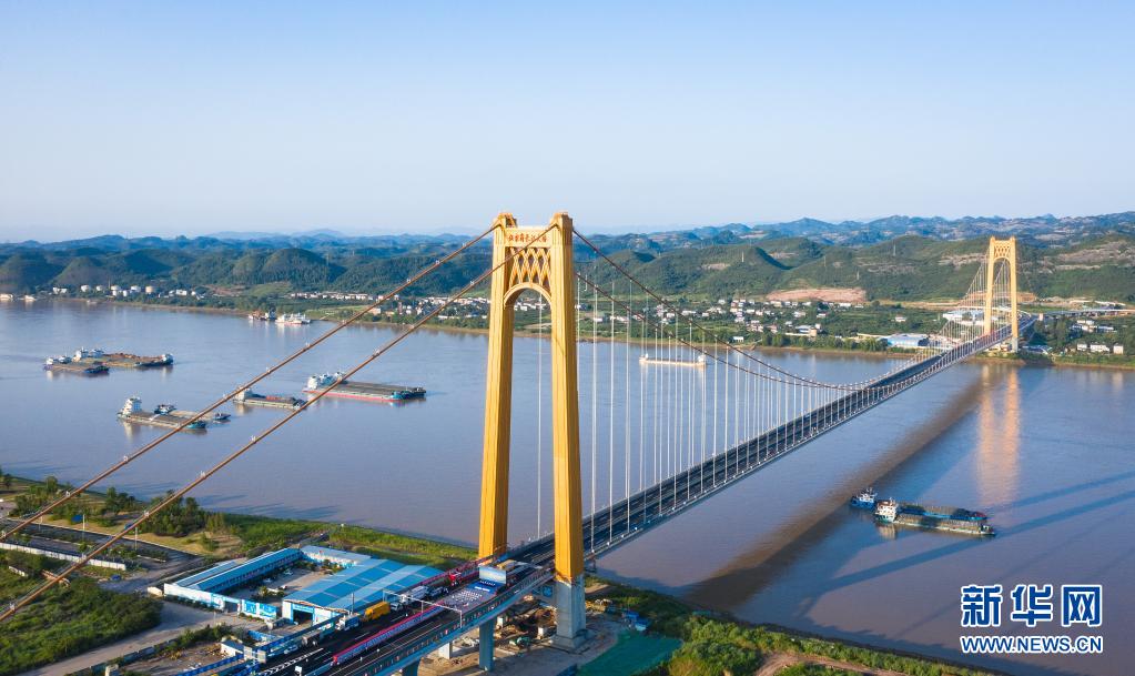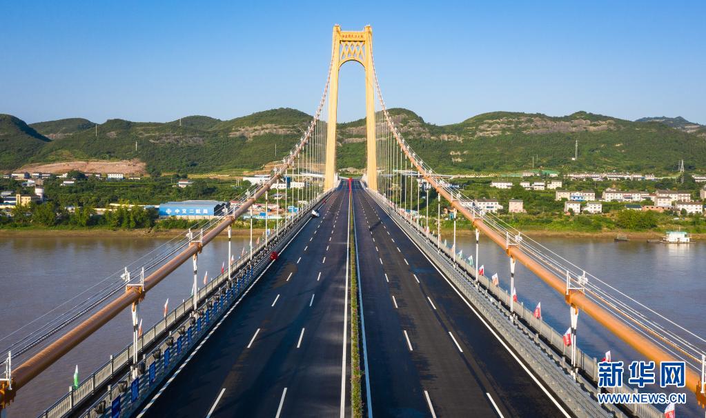 7月30日拍摄的宜昌伍家岗长江大桥。 当日,湖北宜昌伍家岗长江大桥建成试通车。为给中华鲟“让路”,大桥采用主跨1160米悬索桥一跨过江方案,不在水中建桥墩,这一方案相较其他方案多耗资1亿元。 宜昌伍家岗长江大桥是《长江经济带综合立体交通走廊规划》中湖北省19条过江通道之一,是长江宜昌段第9座长江大桥,也是宜昌快速路环网的控制性节点工程。大桥全长2813米,桥宽31.5米,设计双向6车道,主线设计时速80公里,将于8月2日正式通车。 新华社记者 肖艺九 摄