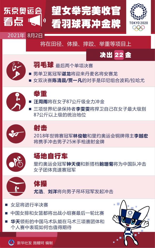 中新网客户端8月2日电 东京奥运今天将产生22枚金牌,在举重女子87公斤级和87公斤以上级、羽毛球男单和女双、自行车女子团体争先赛以及体操等项目上拥有多个夺金点的中国军团,有望掀起又一个夺金高潮,在金牌总数上追平、甚至超过里约奥运会的26金。(完) |