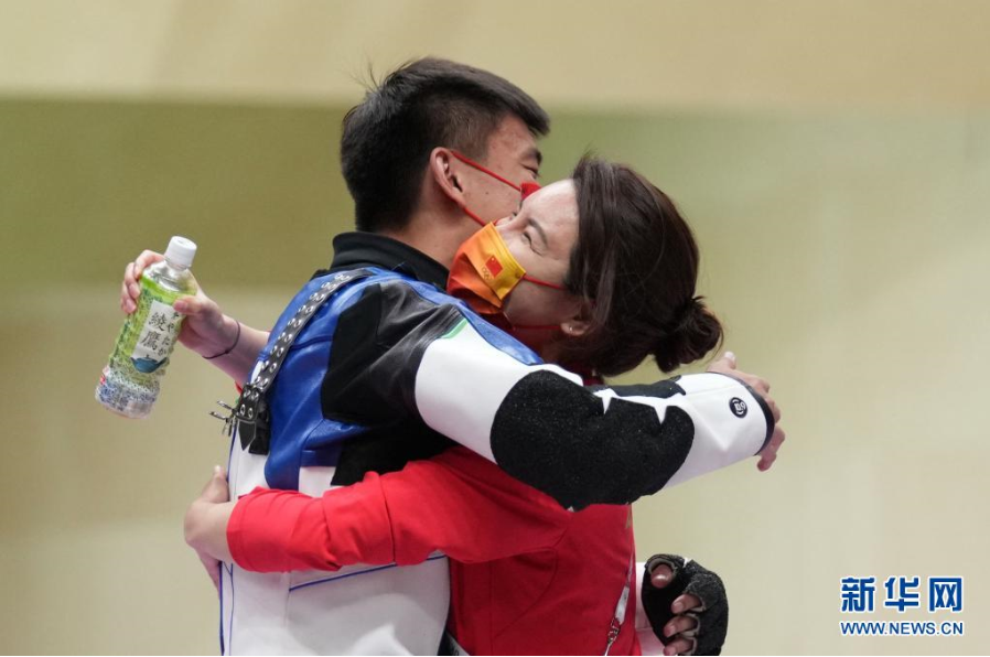 8月2日,中国选手张常鸿(左)赛后与教练杜丽拥抱庆祝。