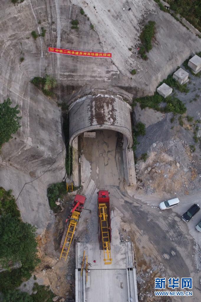 这是广西河池境内的贵南高铁德庆隧道施工现场(8月2日摄,无人机照片)。 8月3日,随着一声响亮的爆破,由中铁二局承建的贵南高铁德庆隧道顺利贯通,标志着全线隧道工程最大的难题被成功破解。 位于广西河池市境内的德庆隧道全长6610米,是贵(贵阳)南(南宁)高铁全线关键控制性工程。全线预计2023年底开通运营,届时南宁与贵阳间通行时间将缩短至2个多小时。 新华社记者 刘岭逸 摄