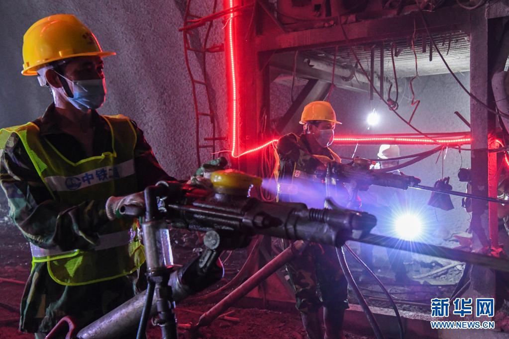 8月2日,在位于广西河池的贵南高铁德庆隧道内,工人用风枪在掌子面打爆破眼。 8月3日,随着一声响亮的爆破,由中铁二局承建的贵南高铁德庆隧道顺利贯通,标志着全线隧道工程最大的难题被成功破解。 位于广西河池市境内的德庆隧道全长6610米,是贵(贵阳)南(南宁)高铁全线关键控制性工程。全线预计2023年底开通运营,届时南宁与贵阳间通行时间将缩短至2个多小时。 新华社记者 曹祎铭 摄 |