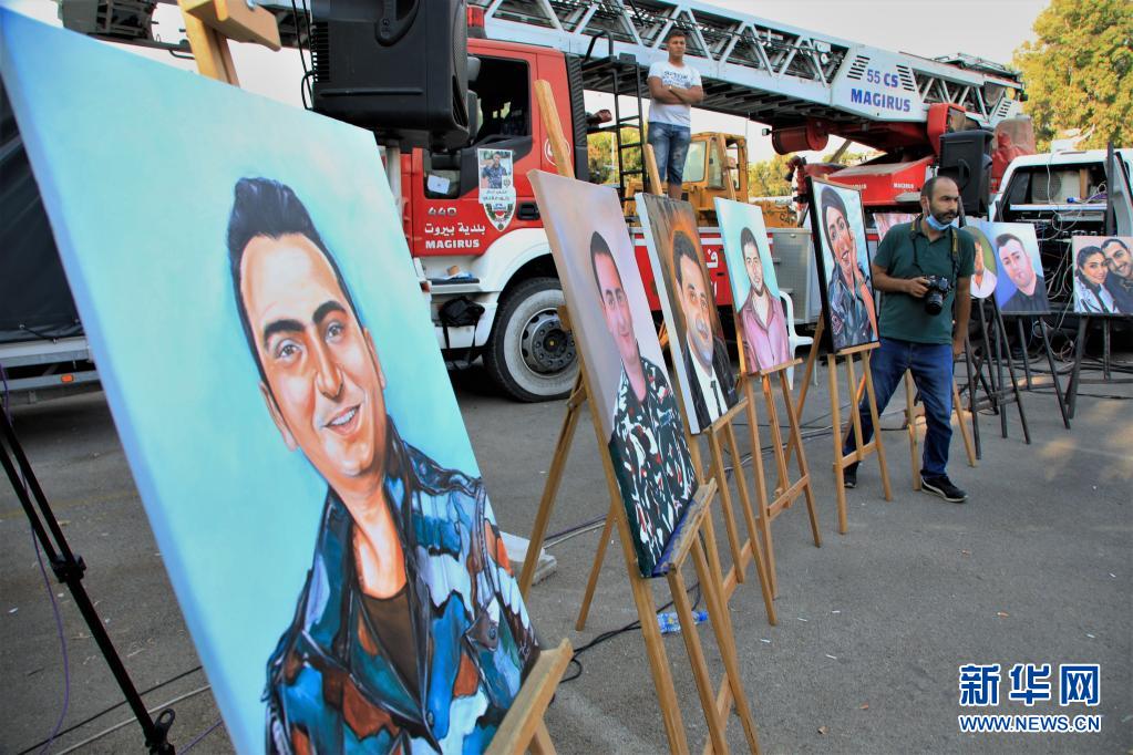8月3日,黎巴嫩贝鲁特消防队总部展出在大爆炸中牺牲的消防员肖像,纪念贝鲁特港口大爆炸一周年。新华社记者 刘宗亚 摄