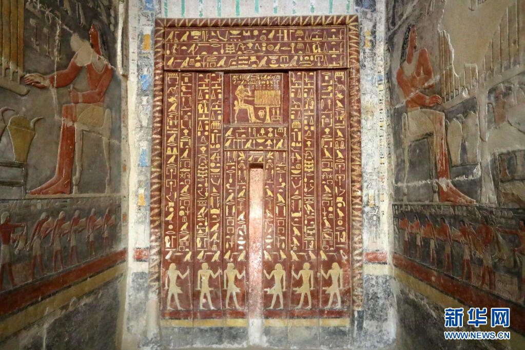 这是8月3日在埃及首都开罗以南的塞加拉地区一个官员墓内拍摄的彩绘浮雕壁画和墓主人雕像。 塞加拉地区是古埃及文明核心遗址所在地,位于开罗以南约30公里,多位法老的金字塔和许多贵族的墓地就位于此。在众多距今4000多年的古墓内,尚有保存完好且体现古埃及贵族地位及百姓日常生活等题材的彩绘浮雕壁画。 新华社记者 隋先凯 摄